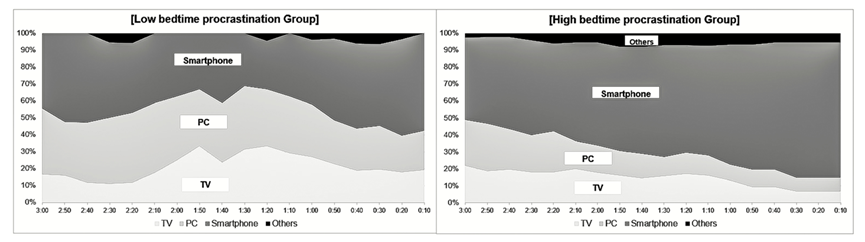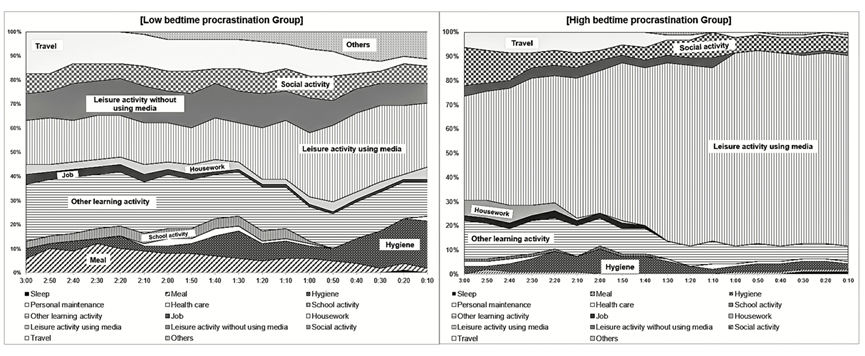 上面这两幅图像分别记录了较少睡前拖延组和严重睡前拖延组睡前3小时的活动。可以看出,严重睡前拖延组花在用电子媒介进行娱乐活动的时间比较少睡前拖延组要多得多。就算不把两个组进行比较、单独看严重睡前拖延组,我们也能够发现,他们这一部分的时间比例高达近80%。
